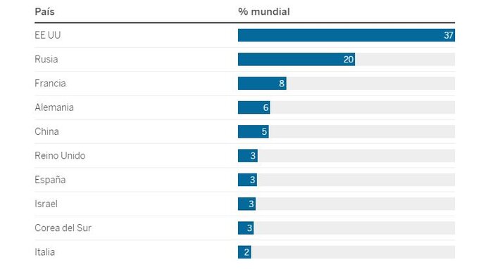 ئەمریکا، ڕووسیا، فەڕەنسا، ئەڵمانیا و چین بڕی سێ لە چواری کۆی ڕێژەی چەکە فرۆشراوەکانی جیهانییان بۆ خۆیان تەرخان کردووە.