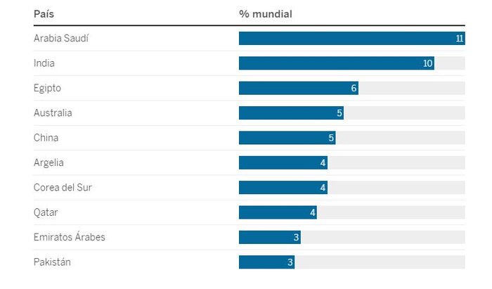 ڕێژەی چەکی هاوردەی سعوودیه ٦١٪ و قەتەر بهرێژهى ٣٦١٪ لە ماوەی ئەو ساڵانەدا بەرز بووەتەوە.