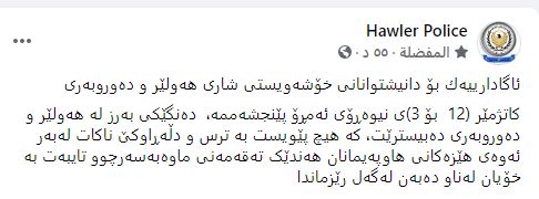 پۆلیسى ههولێر پهیامهكهى له تۆڕى كۆمهڵایهتى فهیسبووك بڵاوكردووهتهوه ئهمه دهقهكهیهتى: