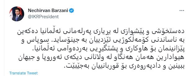 سهرۆك نێچیرڤان بارزانى سهرۆكى ههرێمى كوردستان له پهیامێكدا دهسخۆشى خۆى بۆ پهرلهمانى ئهڵمانیا راگهیاند، كه بڕیارى دا كۆمهڵكوژیى ئێزدییهكان به جینۆساید بناسرێت.