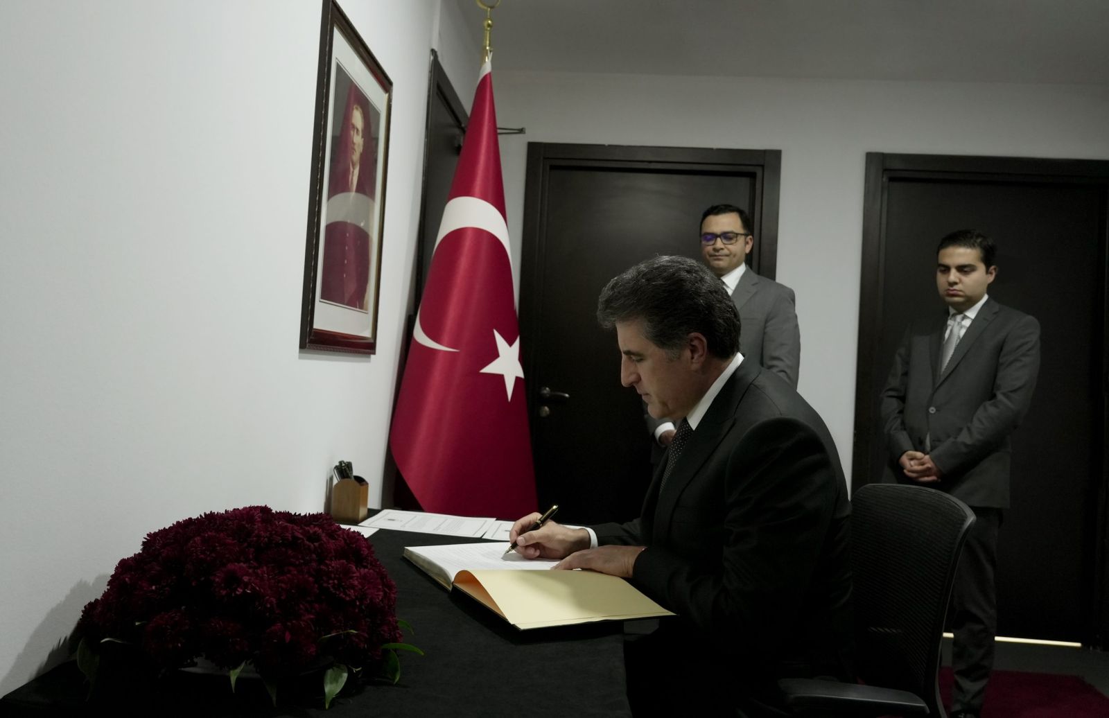 ئەمڕۆ یەکشەممە (12/شوبات/2023) سەرۆک نێچیرڤان بارزانی، سهرۆکی ههرێمی کوردستان، له کونسولخانهی گشتیی تورکیا له ههولێر، بهشداری له پرسهی قوربانییانی بوومهلهرزهکهی شهشی ئهم مانگهدا کرد که له تورکیا و سووریا به ههزاران قوربانیی لێکهوتهوه.