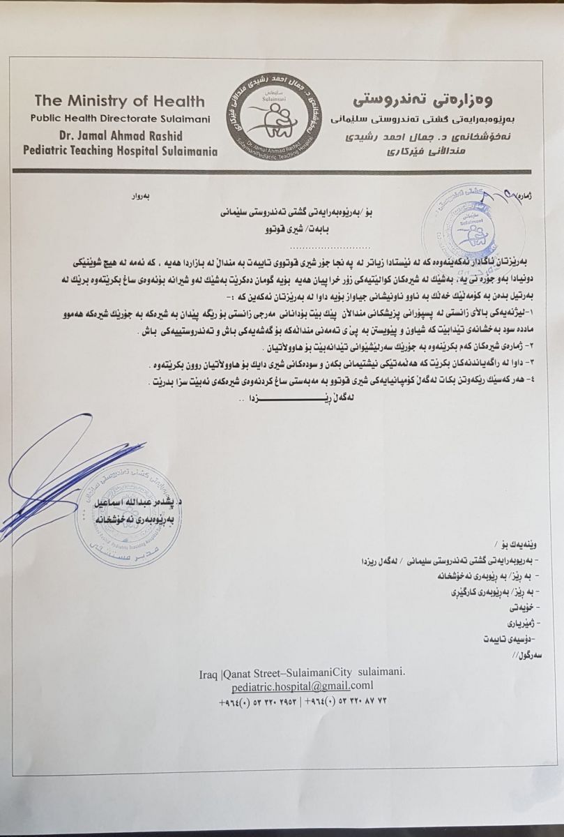 د. پشدەر عەبدوڵڵا ئیسماعیل بەڕێوەبەرى نەخۆشخانەى د. جەمال احمد رشیدى مندڵانى فێرکارى لە نووسراوێکدا کە ئاراستەى بەڕێوەبەرایەتى گشتیى تەندروستى سلێمانى کردووە، دەڵێت، بەشێک لە شیرەکان کوالێتیان خراپە، گومان دەکرێت بەشێک لەو شیرانە بۆ ئەوەى ساغ بکرێتەوە بڕێک بەرتیل بدەن بە هەندێ خەڵک بە ناو و ناونیشانى جیاواز.