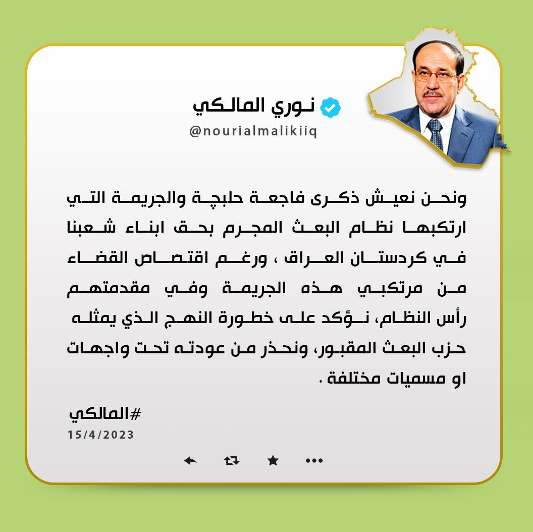 مالیكی بەو بۆنەوە هۆشداری لە گەڕانەوەی حزبی بەعسی تاوانبار دەدات و لە تویتەكەی دەڵێ، "ئێمە ئێستا لە یادی كارەساتی هەڵەبجە و ئەو تاوانە دەژین كە رژێمی بەعسی تاوانبار دەرهەق بە گەلەكەم لە كوردستانی عێراق ئەنجامی دا. هەر چەندە دادگا ئەنجامدەرانی ئەو تاوانەی، بەر لەهەموویان سەرۆكی رژێمەكەی سزا دا، بەڵام ئێمە دووپات لەسەر ترسناكی ئەو رێبازە دەكەینەوە كە حزبی بەعسی گۆڕبەگۆڕ پەیڕەوی دەكات، هۆشداریش دەیدەن لە گەڕانەوە بە هەر ناوێكی جیاوازیش بێت".