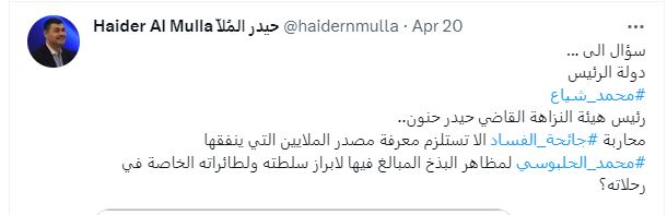 لە 20ی ئەم مانگە حەیدەر مولا لە تویتەر نووسراوێكی بڵاوكردووەتەوە، گوایە دەری دەخات حەلبووسی لەگەشتێكدا فڕۆكەی تایبەتی بەكارهێناوە. لە تویتەكەی حەیدەر مولا داوا لە محەمەد شیاع سوودانی سەرۆكی حكومەتی عێراق و حەیدەر حەنوون سەرۆكی دەستەی دەستپاكی دەكات، لێكۆڵینەوە ئەو ملیۆنانە بكەن كە حەلبووسی لە گەشتە تایبەتەكانی بەكاردی دەهێنێ.