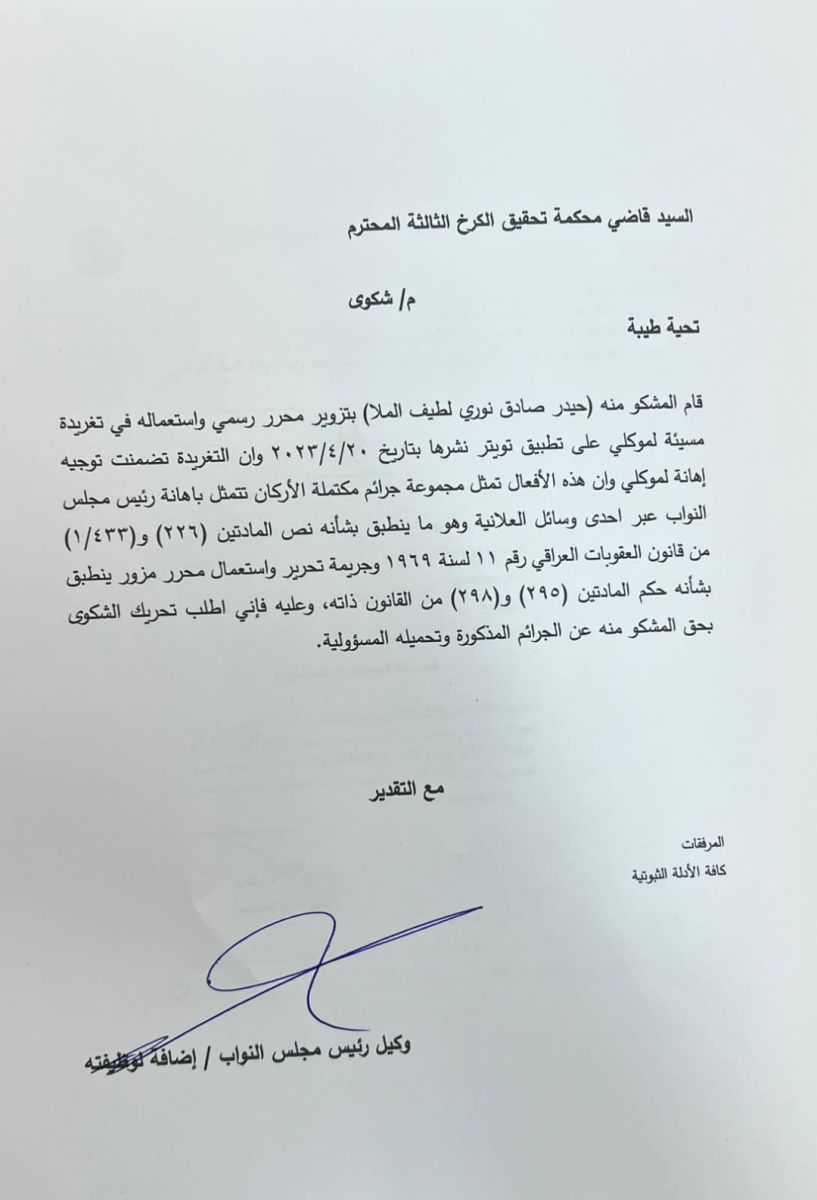 محەمەد حەلبووسی سەرۆكی پەرلەمانی عێراق لە دادگای لێكۆڵینەوەی سێیەمی كەرخ لە بەغدا سكاڵایەكی لە دژی حەیدەر مولا سیاسەتمەداری سوننە تۆماركردووە و بە ناوزڕاندن و ساختەكردنی نووسراو تۆمەتباری دەكات.