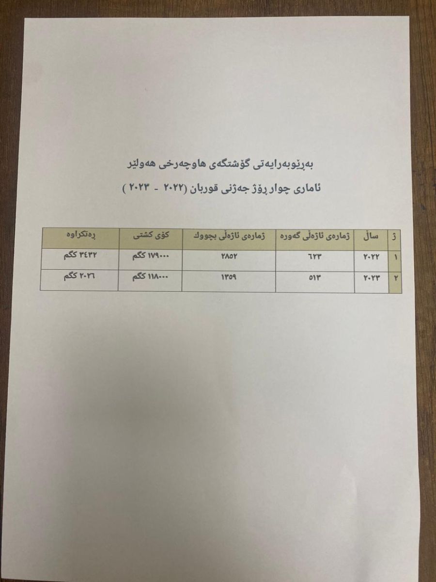 ئەمە لە کاتێکدا، ساڵى ڕابردوو لە هەولێر، له چوار رۆژی جهژنی قورباندا (623) ئاژهڵی گهوره و (2852) ئاژهڵی بچووك به بڕی (179000) كیلۆگرام گۆشت كراوهته قوربانی، تێیدا (3432) كیلۆگرام گۆشتیش رهتكراوهتهوه.