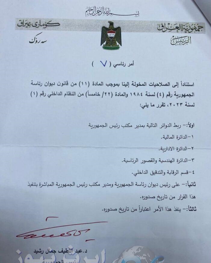 ئەمڕۆ سێشەممە 11ی تەمووزی 2023 میدیاكانی عێراق بەڵگەیەكیان بڵاوكردووەتەوە، كە فەرمانی سەرۆكایەتی عێراقە بە ژمارە (7) تێیدا هاتووە، "بەگوێرەی دەسەڵاتە رێگەپێدراوەكان لە مادەی 11ی یاسای دیوانی سەرۆكایەتی كۆمار ژمارە چواری 1984 و مادەی 22/ پێنجەم، لە پەیڕەوی ناوخۆ ژمارە یەكی 2023 ئەم بڕیارە دراوە"