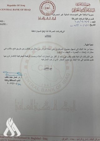 ئەمڕۆ هەینی (13/ تشرینی یەكەم/ 2023) ماڵپەڕی (واع) بڵاوی كردەوە، لەو راگەیێندراوەی بانكی ناوەندی هاتووە كە لەلایەن عەمار حەمەد خەلەف جێگری پارێزگاری بانكی ناوەندی ئاراستەی كۆمپانیاكانی دراوە كراوە، ئاماژە بەوە دەكات، وەك هەوڵێكی ئەو بانكە بۆ ئاسانكاری بۆ گەشتیاران بۆ بەدەستهێنانی دۆلار لە رێگەی كۆمپانیكانتانەوە و كردنەوەی نووسینگەكان لە فڕۆكەخانەكانی (بەغدا و بەسڕە و نەجەف و هەولێر.
