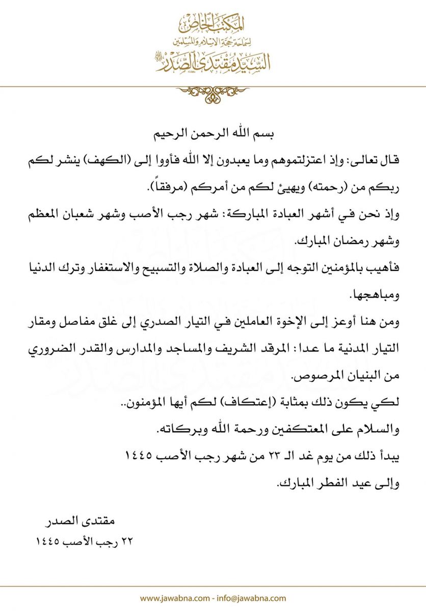 لە بەشێكى ديكەى ديكەى پەيامەكەى موقتەدا سەدر جەخت لەسەر ئەوە دەكاتەوە، پێويستە شوێنكەوتووانى ئەو كارانە بكەن بە ئيعتيكاف، كە مەبەستى پێى مانەوەيە لە مزگەوتەكان بە نيەتى پەرستش.