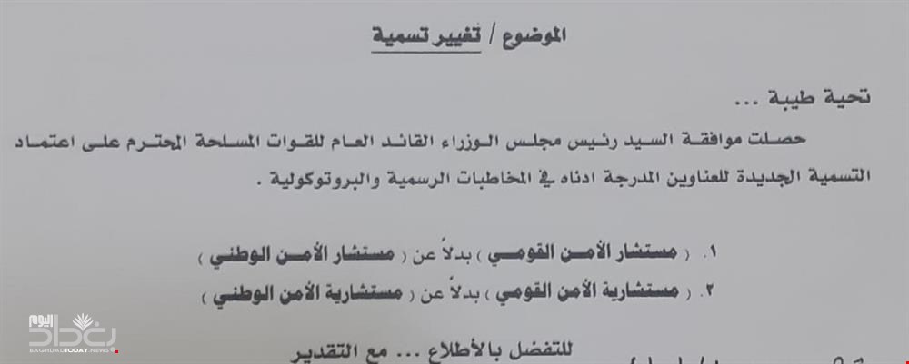 بهگوێرهى بهڵگهیهكى كه دهست ماڵپهرى بهغداد تودهى عێراقى كهوتووه، مستهفا كازمى سهرۆكى حكومهتى عێراق و فهرماندهى گشتى هێزه چهكدارهكانى عێراق ناوى راوێژكارى ئاسایشى نیشتمانى بۆ ئاسایشى نهتهوهیى عێراق گۆڕیوه.