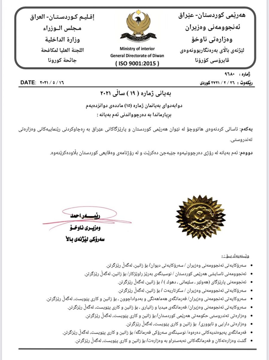 ئهمڕۆ یهكشهممه 16ى ئایار، وهزارهتى ناوخۆى ههرێمى كوردستان به بهیانى ژمارهى 19ى ساڵى 2021 بڕیارى ئاسایى كردنهوهى هاتوچۆى له نێوان ههرێمى كوردستان و پارێزگاكانى عێراق راگهیاند و روونى كردووهتهوه، به پابهندبوون به رێنماییهكانى تهندروستى دهبێت.