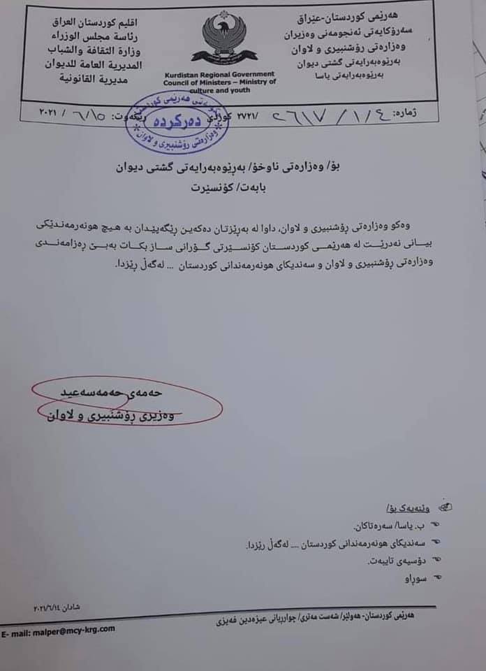 لە نووسراوێکدا لە ڕۆژى (16)ى حوزەیرانى (2021)، کە ئیمزاى حەمەى حەمە سەعید، وەزارەتى ڕۆشنبیرى و لاوانى لەسەرە، ئاراستەى وەزارەتى ناوخۆى هەرێم کراوە، تێیدا هاتووە، "وەکو وەزارەتى ڕۆشنبیرى و لاوان، داوا لە بەڕێزتان دەکەین ڕێگەپێدان بە هیچ هونەرمەندێکى بیانى نەدرێت لە هەرێمى کوردستاندا کۆنسێرتى گۆرانى ساز بکات."