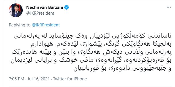 ئهمڕۆ ههینى 16ى تهمووز نێچیرڤان بارزانى لهسهر ههنگاوى به جینۆسایدناساندنى كۆمهڵكوژى ئێزدییهكان لهلایهن پهرلهمانى بهلجیكاوه پهیامێكى بڵاوكردهوه، ئهمه دهقهكهیهتى: