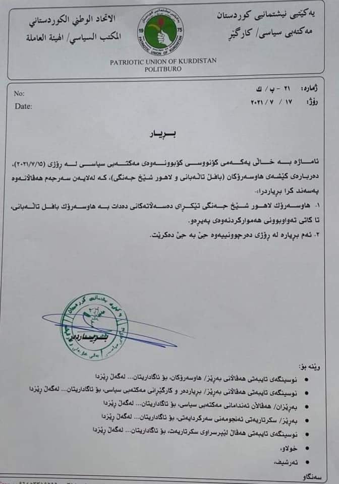 ئهمڕۆ شهممه 17ى تهمووز نووسراوێك بڵاوكراوهتهوه كه باس له بڕیارى مهكتهبى سیاسى یهكێتى دهكات، كه له بارهى لاهور شێخ جهنگى دراوه. بڕیارهكه مێژووى ئهمڕۆى لهسهره و به ژماره 21 ب/ك دهرچووه له دهقهكهى هاتووه، “هاوسهرۆك لاهور شێخ جهنگى تێكڕاى دهسهڵاـهكانى دهدات به هاوسهرۆك بافڵ تاڵهبانى تا كاتى تهواوبوونى ههمواركردنهوهى پهیڕهو”. له خالێكى تر باس لهوه كراوه، ئهم بڕیارهیش له رۆژى دهرچوونییهوه جێبهجێ دهكرێت.\