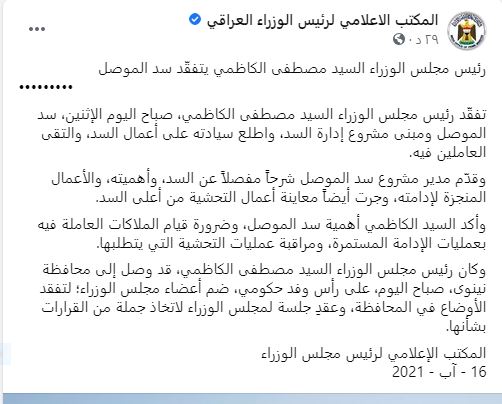 بهگوێرهى راگهیێندراوێك كه لهلایهن نووسینگهى كازمى سهرۆك وهزیران مستهفا كازمى سهرهتا سهردانى بهنداوى مووسڵ كردووه و لهگهڵ تیمى نۆژهنكردنهوهى بهنداوهكه كۆبووهتهوه و دووپاتى لهسهر گرنگى بهنداوى مووسڵ كردووهتهوه.