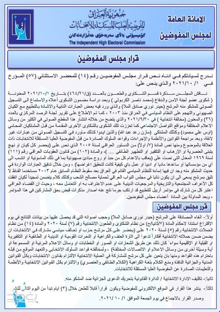 دوێنێ كۆمسیۆنى باڵاى ههڵبژاردنهكانى عێراقى بڕیارى دوورخستنهوهى حهیدهر مولاى داوه، به تۆمهتى ئهوهى تۆمارێكى دهنگى بڵاوكراوهتهوه، تێیدا مولا هێرش دهكاته سهر سیستهمى سیاسى عێراق و به گوتهى كۆمسیۆن "وشهى ناشیاوى بهكارهێناوه" جیا لهمهیش باسى ئاساییكردنهوهى پهیوهندى عێراق و ئیسرائیلى كردووه.