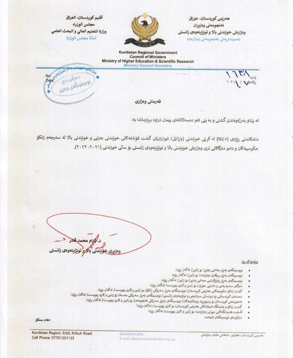 دەقى نووسراوى وەزارەتى خوێندنى باڵا و توێژینەوەى زانستى: