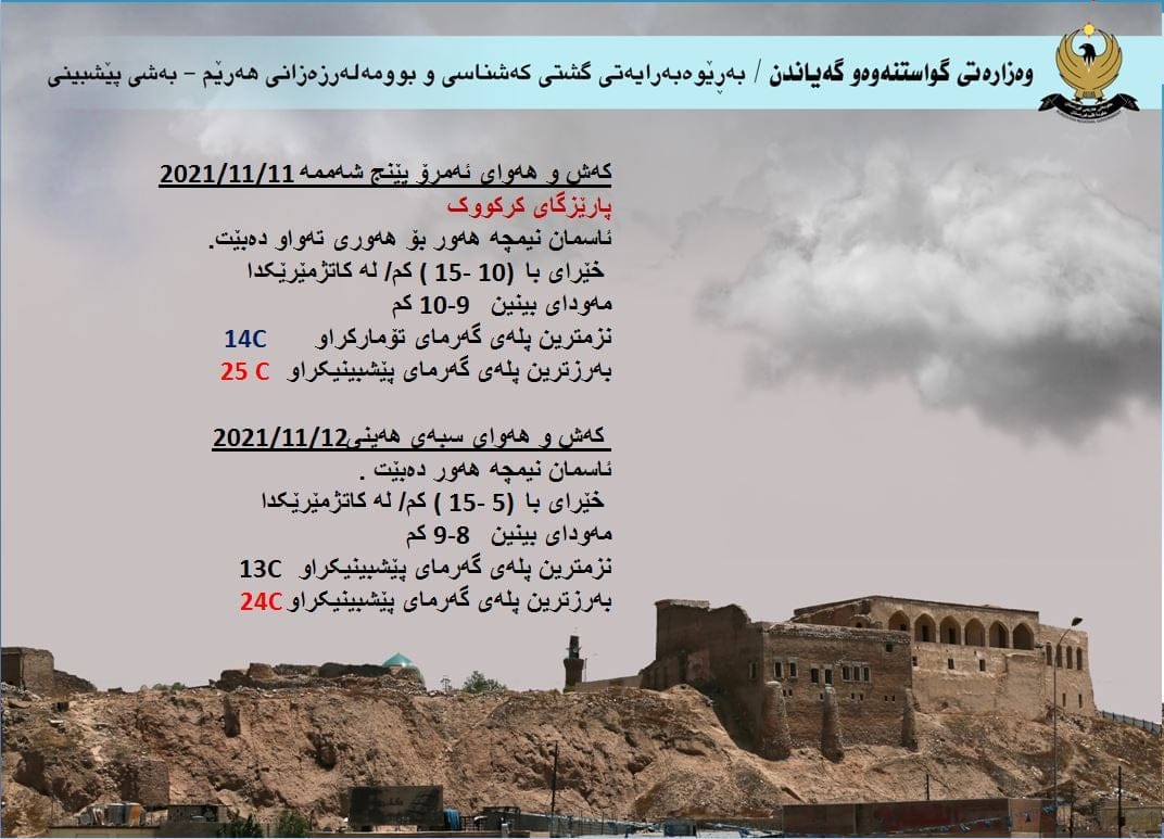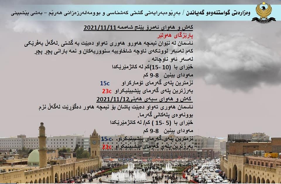 ئەمڕۆ پێنجشەممە (11)ى تشرینى دووەم (2021)، بەرێوەبەرایەتیی گشتی كەشناسی و بومەلەرزەزانی هەرێمی كوردستان لە ڕاگەیێندراوێکدا کەشوهەواى پێشبینیکراوى ئەمڕۆ و سبەى ڕاگەیاند و دەڵێت، بەهۆى هاتنى بارستە هەواییەکى نیمچە سارد بۆ سەر هەرێمى کوردستان تا نزیکەى 2-4 پلە پلەکانى گەرما نزم دەبێتەوە.