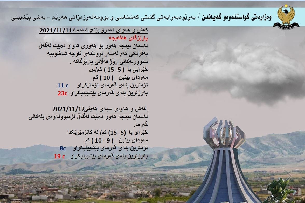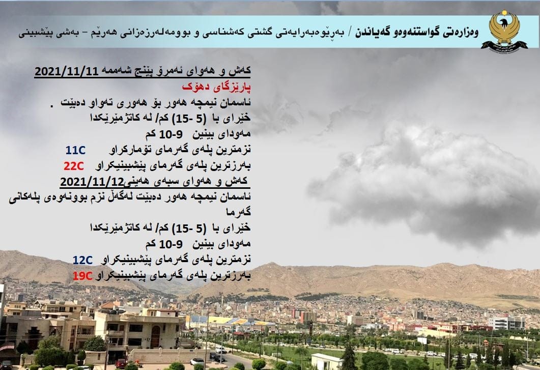 بەرێوەبەرایەتیی گشتی كەشناسی و بومەلەرزەزانی هەرێمی كوردستان پێشبینى کەشوهەواى ئەمڕۆ پێنجشەممە و سبەى هەینى بڵاودەکاتەوە و تێیدا هاتووە، بارستە هەواییەكی نیمچە سارد ڕوو لەهەرێمى کوردستان دەكات.