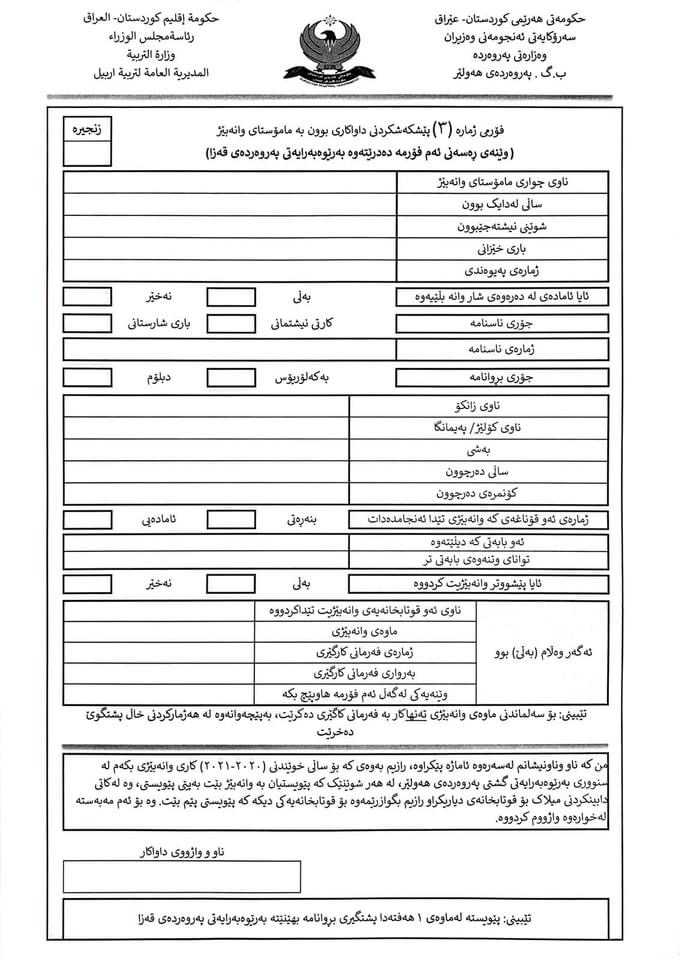 بهڕێوهبهرایهتى گشتى پهروهردهى ههولێر له راگهیهنراوێكدا ههلى كار به وانهبێژان دهدات و بۆ ئهم مهبهستهیش فۆرمێك بڵاو دهكاتهوه.