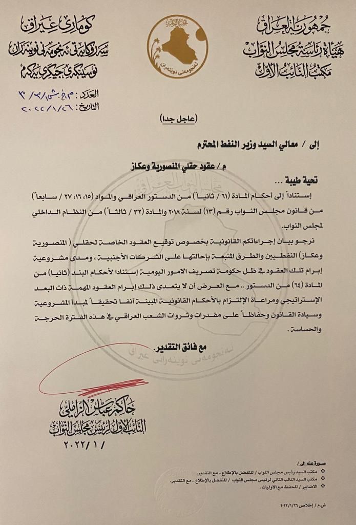 وهك دهردهكهوێت بهڵگه دوێنێ 26ى كانوونى دووهم واژوو كراوه، ناوهڕۆكهكهى نووسراوێكى بهپهلهیە و داوا له وهزیرى نهوت دهكرێت روونكردنهوه لهسهر یاسایبوونى دوو گرێبهست بدات كه لهبارهى كێڵگهكانى مهنسوورییه له دیاله و عكاز له ئهنبار كراون.