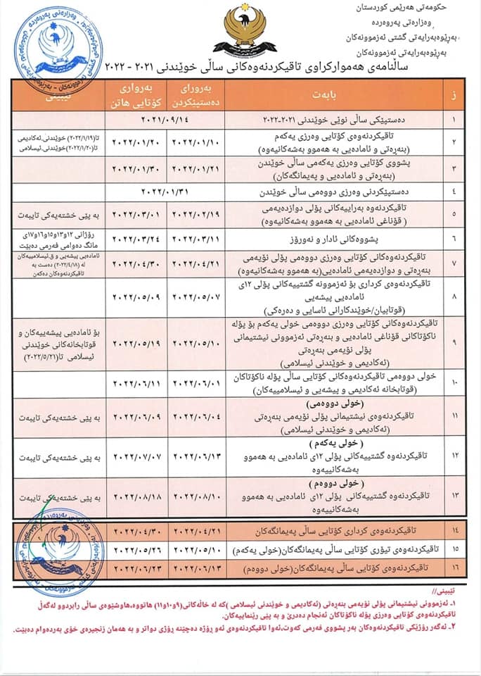 لە نوسراوەکەدا هاتووە: تاقیکردنەوەکانی بەراییەکانی پۆلی 12 لە (19/شوبات/2022) دەستپێدەکات و لە (01/ئازار/2022) کۆتاییان دێت. هەروەها تاقیکردنەوەکانی کۆتایی وەرزی دووەمی پۆلی نۆیەم و 12ـی ئامادەیی لە (21/نیسان/2022 )دەستپێدەکات و لە (30/نیسان/2022 )کۆتاییان دێت.