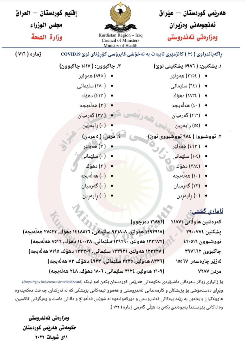 ئهمڕۆ ههینی (11/ شوبات/ 2022) وەزارەتی تەندروستی ئاماری کۆرۆنای بڵاوکردهوه و به گوێرهی ئامارهکهش (984) کهس له ههرێمی کوردستان تووشی کۆرۆنا بوونه و (5) تووشبووی پهتاکهش گیانیان لهدهستداوه.