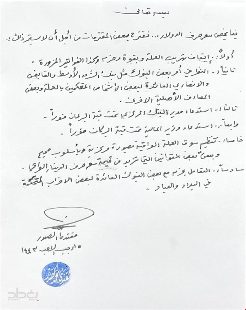ئهمڕۆ پێنجشهممه 17ى شوباتى 2022 میدیاكانى عێراق بهڵگهیهكى دهستنووسى موقتهدا سهدریان بڵاوكردووهتهوه كه تێیدا لهسهر نرخى دۆلار له عێراق شهش خاڵى پێشنیار كردووه.