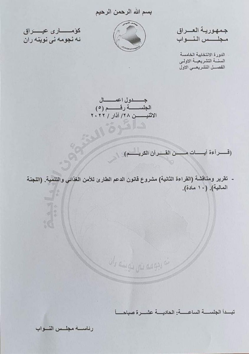 لە نوسراوەکەدا هاتووە: کۆبونەوەکە تایبەت دەبێت بە خوێندنەوەی دوەم بۆ پرۆژە یاسای هاریکاری لەناکاو بۆ ئاسایشی خۆراک، کە لەلایەن لیژنەی دارایی پەرلەمانەوە ئامادەکراوە.