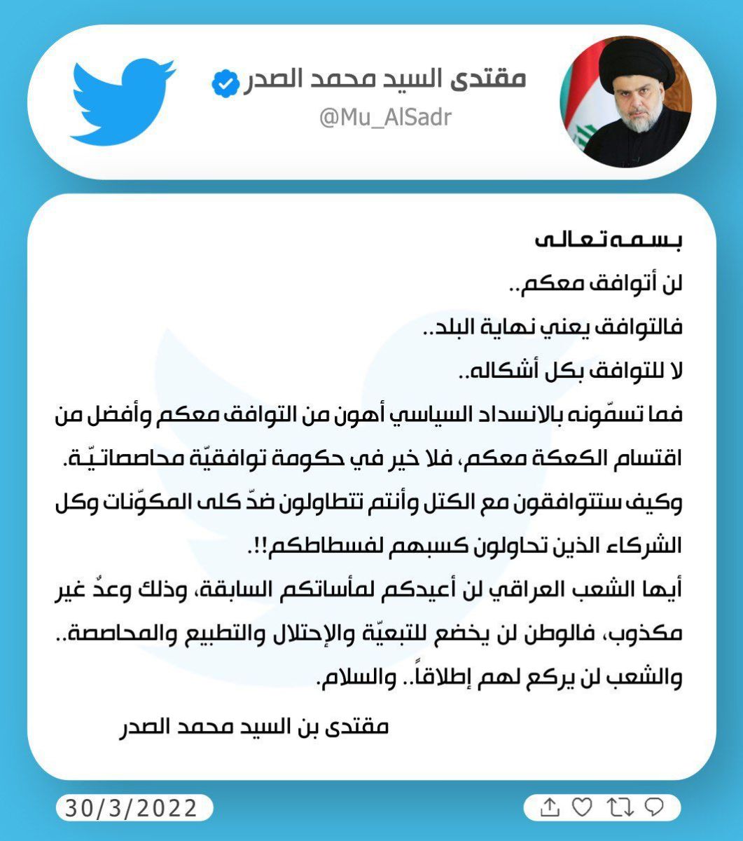 ئهمڕۆ چوارشهممه 30ى ئادارى 2022 موقتهدا سهدرى رێبهرى رهوتى سهدر پهیامێكى له تویتهر بڵاوكردووهتهوه و تێیدا به ههموو شێوهیهك رهتى دهكاتهوه كه رێككهوتن و تهوافووق لهگهڵ لایهنه شیعهكان بكات