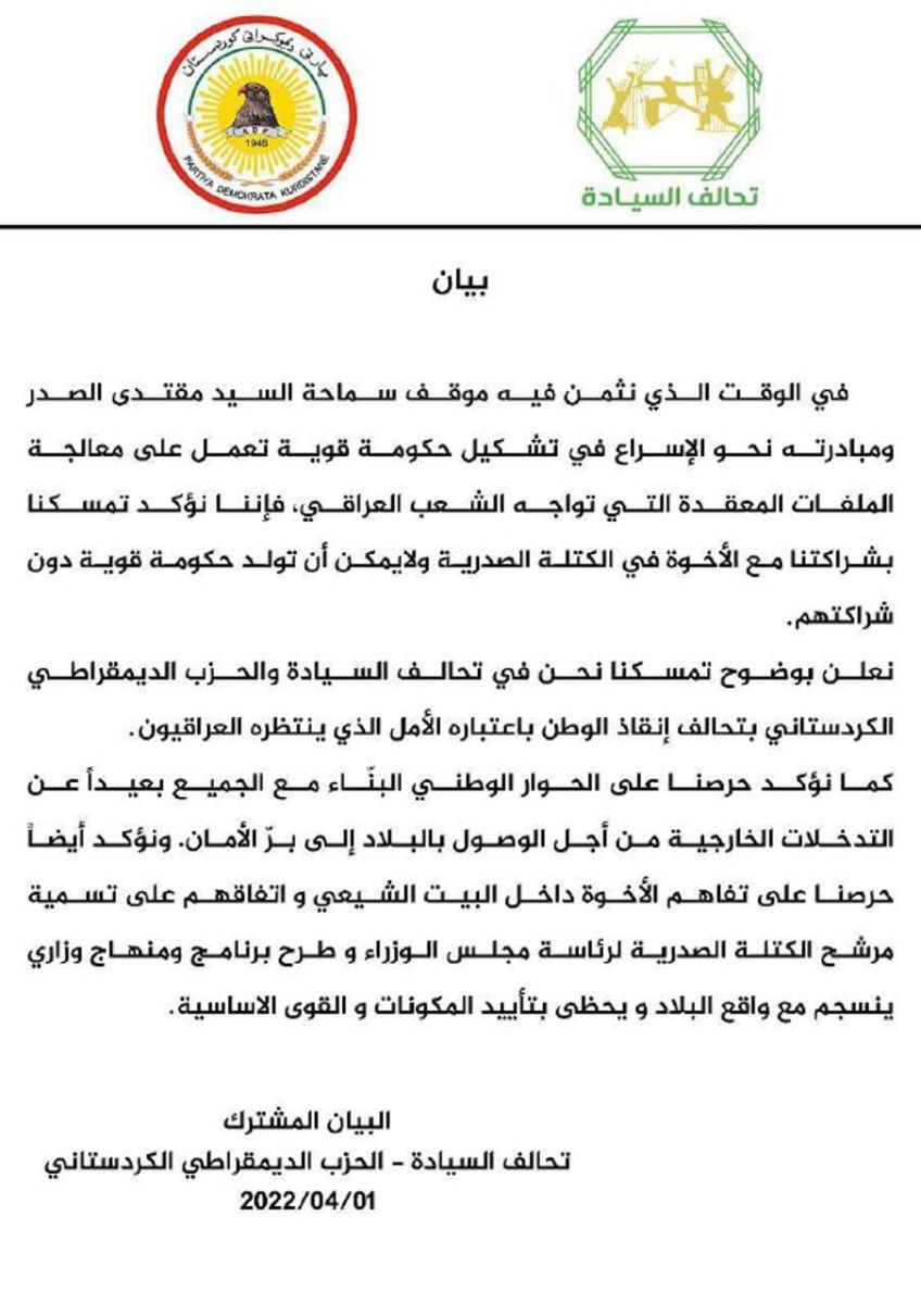 ئهمڕۆ ههینى یهكى نیسانى 2022 پارتى دیموكراتى كوردستان و هاوپهیمانى سهروهریى سوننه راگهیێندراوێكى هاوبهشیان بڵاوكردووهتهوه و تێیدا دووپات لهسهر دهستگرتنیان به هاوپهیمانى "رزگاركردنى نیشتیمان" دهكهنهوه و جهخت لهسهر هاوپهیمانێتى سهدر دهكهنهوه.