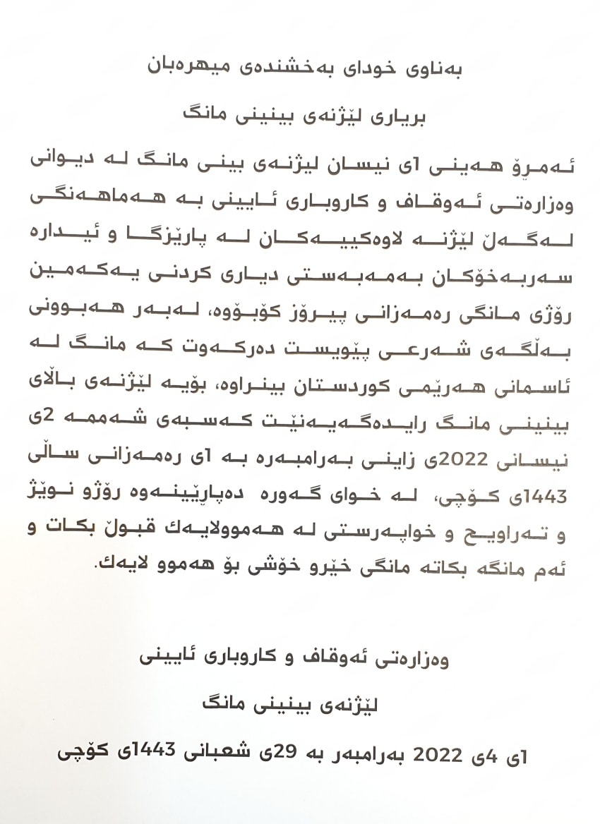 لیژنهى بینینى مانگیش له ههرێمى كوردستان ئێوارهى ئهمڕۆ راگهیاند، به بوونى بهڵگهى شهرعییهوه سبهى له ههرێمى كوردستان یهكهم رۆژى مانگى رهمهزانه.