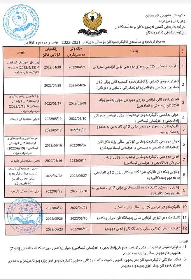 پێشتر وهزارهتى پهروهرده بڕیارى دا بوو، تاقیكردنهوهى وهرزى دووهمى پۆلى نۆیهم و دوانزهم له كۆتایى مانگى نیسان بكرێت، بهڵام ئێستا به دواخستنى تاقیكردنهوهى پۆلى دوانزه تهنیا پۆلى نۆیهم تاقیكردنهوهى وهرزى دووهم دهكهن، كه رۆژى 20ى ئهم مانگهیه.