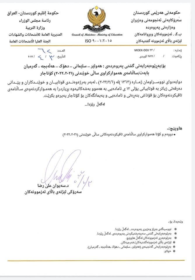 ئهمڕۆ یهكشهممه سێی نیسان، ئالان حهمهسهعید وهزیرى پهروهردهى حكومهتى ههرێمى كوردستان له لێدوانێكى بۆ رۆژنامهنووسان رایگهیاند، "بۆ بەرژەوەندی قوتابیان و خوێندکارانی قۆناخی 12ی ئامادەیی بۆ ئەوەی دەرفەتی باشتری خوێندنیان هەبێت، تاقیکردنەوەکانی وەرزی دووەمی پۆلی 12ی ئامادەیی بۆ پاش جەژنی رەمەزانی پیرۆز دوادەخرێت."