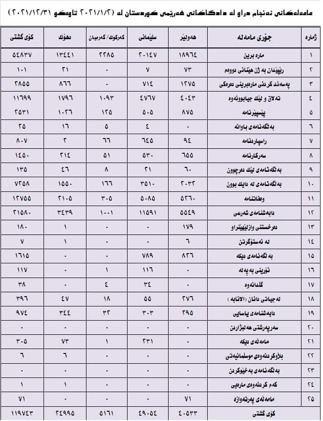 ئەمڕۆ دووشەممە( چواری نیسان/2022) داتا و ئاماری دادگاکانی هەرێمی کوردستان بۆ ساڵی (2021) راگەیاندرا تێیدا هاتووە، "مارەبڕین لە شاری هەولێر (18964) لە سلێمانی (20147)، کەرکووک و گەرمیان (2285) دهۆک، (13441) کۆی گشتی مارەبڕینی ساڵی2021 ( 54837) بووە، کە زۆرترین مارەبڕین لەنێوان تەمەنی (20بۆ 24) ساڵی بووە".