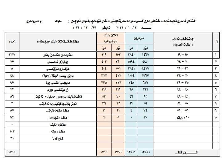 سهبارهت به جیابوونهوه و تهڵاقیش بهگوێرهى ئامارهكان 11 ههزار و 699 تهڵاق له شارهكانى كوردستان روویان داوه، لهوانه "لەشاری هەولێر (4043)، سلێمانی(4767) ،کەرکووک و گەرمیان (1093)، لە دهۆک (1719) کۆی گشتی تەڵاق لە هەرێمی کوردستان لە ساڵی 2021دا (11699) بووە، کە زۆرترین رێژەی تەڵاق لە تەمەنی (20 بۆ 24) بووە".