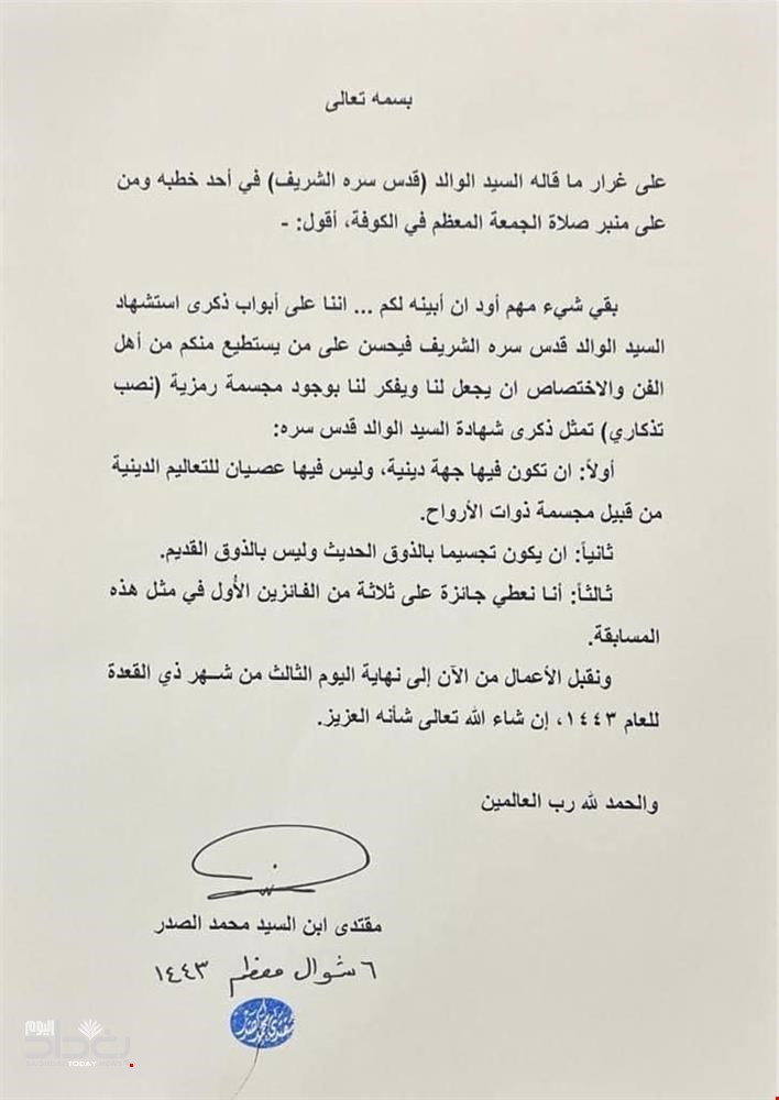 ئهمڕۆ شهممه حهوتى ئایارى 2022 موقتهدا سهدرى رێبهرى رهوتى سهدر نووسراوێكى ئاراستهى هونهرمهندان كردووه و داواى لێكردوون پهیكهرێكى باوكى دروست بكهن، بۆ ئهوهى له ساڵیادى كۆچكردنى دابنرێت.