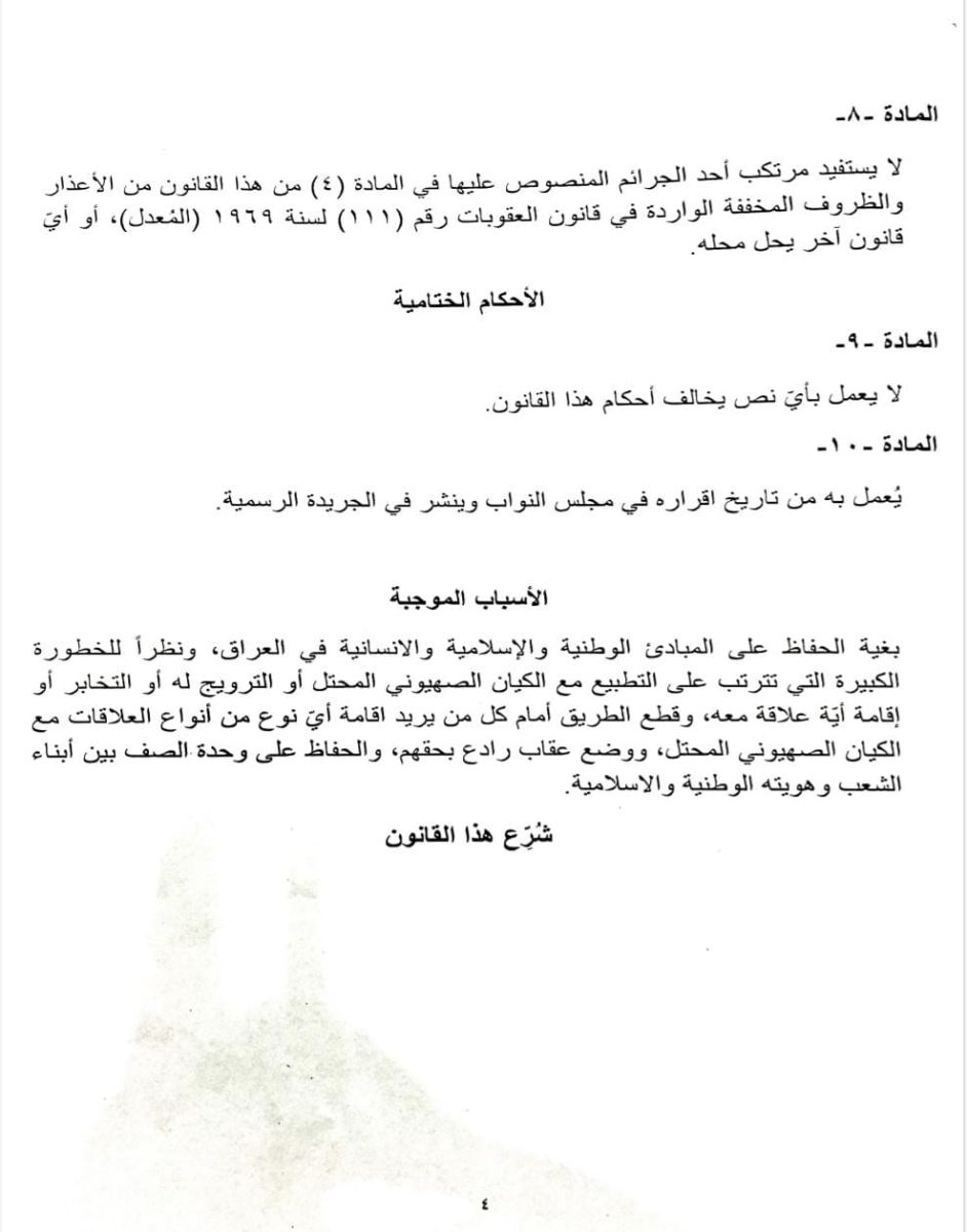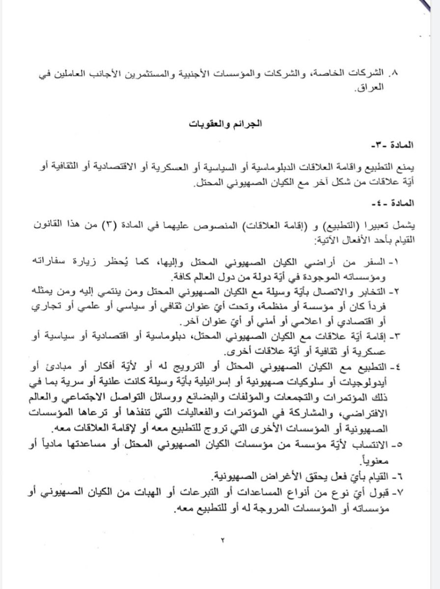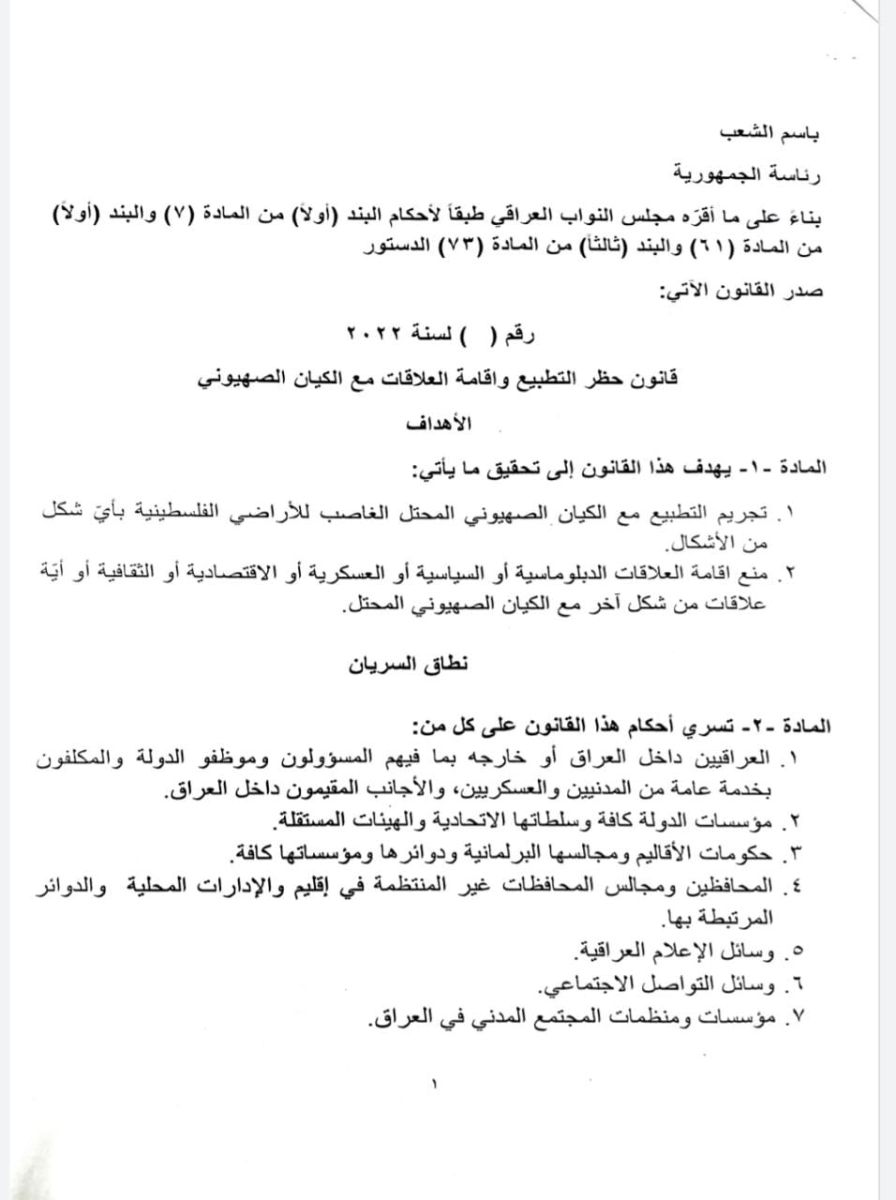 له پڕۆژه یاساى به تاوان ناساندنى ئاساییكردنهوهى پهیوهندى لهگهڵ ئیسرائیل له پهرلهمانى عێراق هاتووه، ههر كهسێك پهیوهندى لهگهڵ ئیسرائیل ههبێت ئهوا له سێداره دهدرێت و یانیش به زیندانى ههتاههتایى سزا دهدرێت.