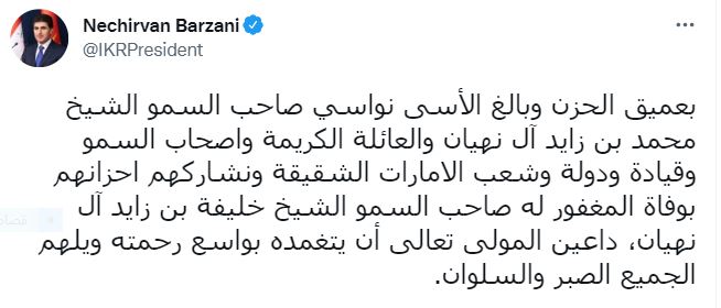 “به خهم و پهژایهكى قووڵهوه سهرهخۆشى خۆمان ئارستهى خاوهن شكۆ شێخ محهمهد بن زاید ئال نههیان و خێزانه بهرێزهكهیان، بهڕێزان و سهركردایهتى و دهوڵهت و گهلى ئيماراتى برا دهكهین، له كۆچى دوایى خاوهن شكۆ خهلیفه بن زاید ئال نههیان بهشدارى خهمیان دهبین، داوایش له خوداى گهوره دهكهین بهر رهحمهتى خۆى بدات و سهبر و دڵنهواییش به ههمووان بدات”.