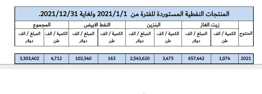 لهوانه ملیۆنێك و 74 ههزار تۆن بهنزینى هاورده كردووه، سێ ملیۆن و 457 ههزار تۆن گازوایل، 102 ملیۆن و340 ههزار تۆن نهوتى سپى هاورده كردووه، كه كۆى بههاى ههموویان سێ ملیار و 303 ملیۆن و 402 ههزار دۆلار بووه.