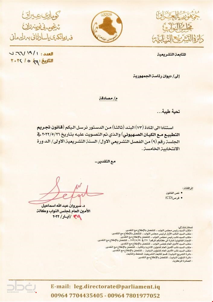بهپێى نووسراوێك كه ئهمرۆ دووشهممه 30ى ئایارى 2022 له لایهن پهرلهمانهوه بڵاوكراوهتهوه، واژۆى د.سیروان عهبدوڵا ئهمیندارى گشتى پهرلهمانى لهسهره، یاساى پهسهندراوى به تاوانناساندنى پهیوهندى ئیسرائیل رهوانهى پهرلهمان كراوه. له نووسراوهكه هاتووه، "بهپێى مادهى 73 بڕگهى سێیهم یاساى به تاوانناساندنى ئاساییكردنهوهى پهیوهندى لهگهڵ ئیسرائیل رهوانهى سهرۆكایهتى كۆمار دهكهین كه له 26/5/2022 له پهرلهمان پهسهندكراوه".