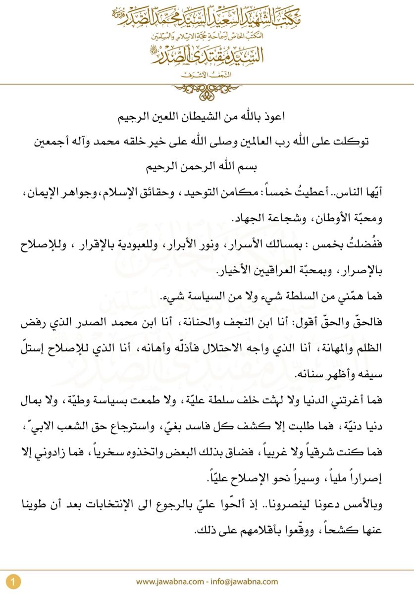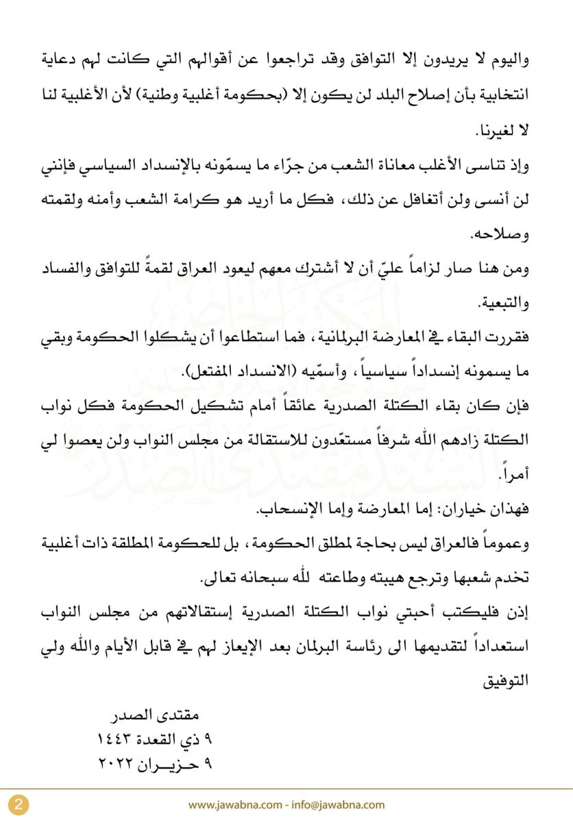 لهكۆتاییشدا دهڵێ، "ههموو پهرلهمانتارانى رهوتى سهدر دهستلهكاركێشانهوهیان بنووسن وهك ئامادهكارییهك بۆ پێشكهشكردنى به سهرۆكایهتى پهرلهمان، ئهمهیش دواى فهرمانێك له رۆژانى داهاتوودا".