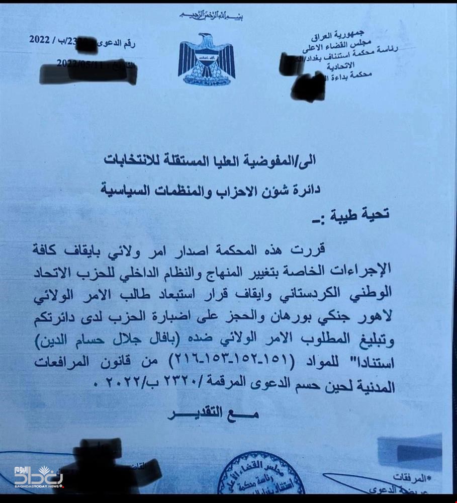 ئهمڕۆ دووشهممه 11 تهمووز له میدیاكانى كوردستان و عێراق بهڵگهیهك بڵاوكراوهتهوه، كه گوایه له دادگاى تێههڵچوونهوهى بهغدا دهرچووه و بۆ فهرمانگهى حزب و رێكخراوه سیاسییهكانى كۆمسیۆنى باڵاى ههڵبژاردنهكان رهوانه كراوه و تێیدا دوو بڕیار دراوه، یهكهمیان ئهوهیه دوورخستنهوهى لاهور شێخ جهنگى بوهستێنرێت، دووهمیان گۆڕانكارى له پهیڕهوى ناوخۆى یهكێتى نهكرێت.