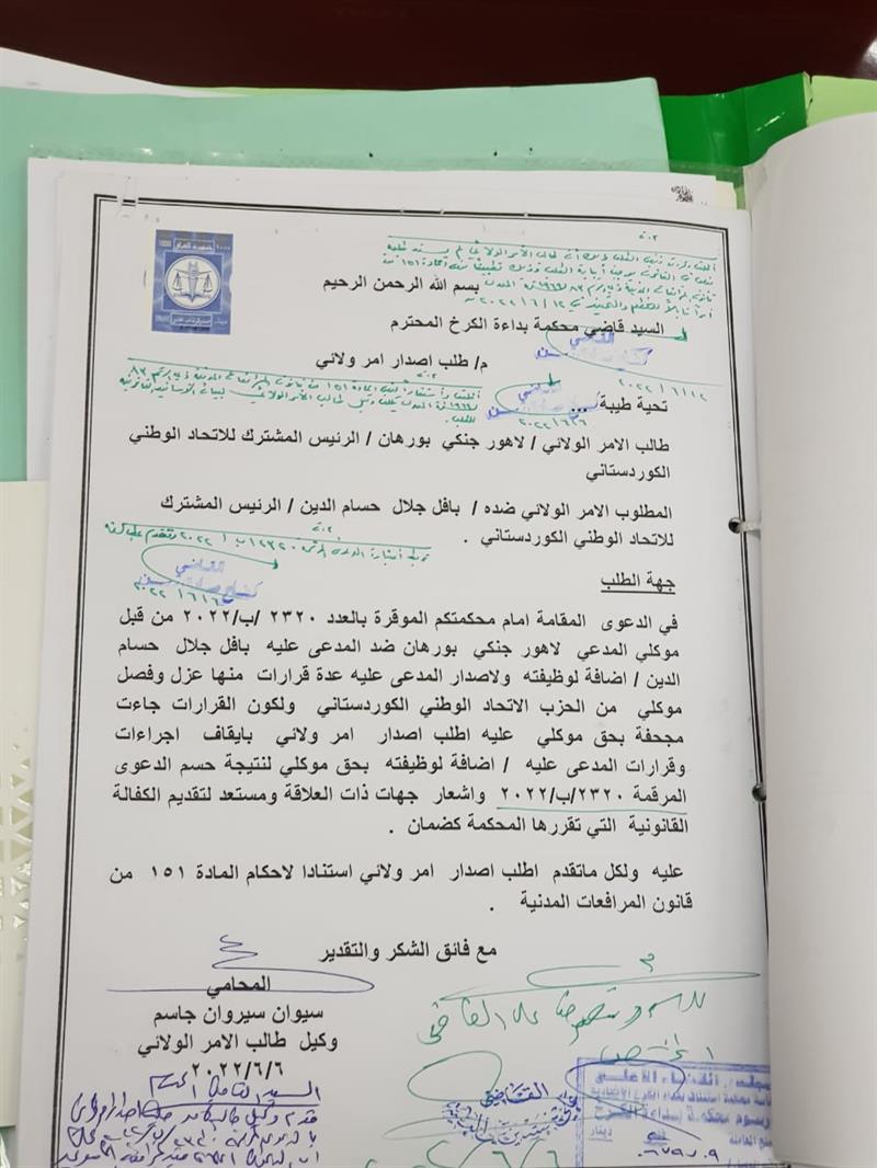 دواى بڵاوبوونهوهى بهڵگهكه میدیاكانى فهرمى یهكێتى بهڵگهیهكى تر بڵاو دهكهنهوه، كه دهریدهخات له 12ى مانگى رابردوو، ههر لهسهرهتاوه داواكهى لاهور شێخ جهنگى رهتكراوهتهوه، چونكه پشتى به “بنهمایهكى یاسایى نهبهستووه”. ههر له بهڵگهكهى یهكێتى دهردهكهوێت كه لاهور شێخ جهنگى هاوسهرۆكى یهكێتى له رێگهى سهیوان سیروانى پارێزهر له شهشى مانگى رابردوو "حوزهیران" داواى دهركردنى ئهمرى وهلائى كردووه، بۆ وهستاندنى ئهو رێكارییانهى كه لهناو یهكێتى دژى ئهو گیراونهتهبهر.