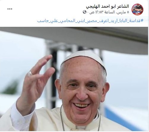 رۆژى ههینى رابردوو له پهیجى خۆى له تۆڕى كۆمهڵایهتى فهیسبووك باوكى ئهو رفێنراوه پهیامێكى بڵاوكردووهتهوه و دهڵێ، "قهداسهتى پاپا دهمهوێ چارهنووسى كوڕهكهم بزانم".