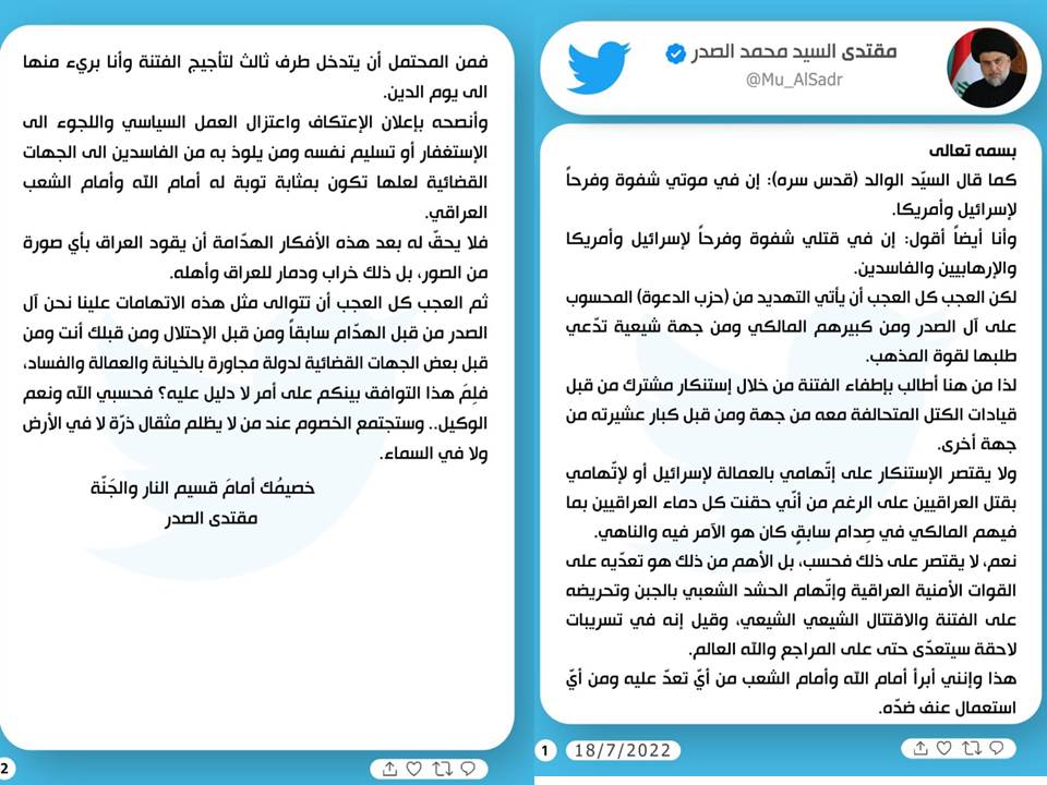 ئهمڕۆ دووشهممه 18/ تهمووزى 2022 موقتهدا سهدرى رێبهرى رهوتى سهدر وهڵامى تۆماره دهنگییهكانى نوورى مالیكى دهداتهوه، كه له چهند رۆژى بڵاوكراوهتهوه.