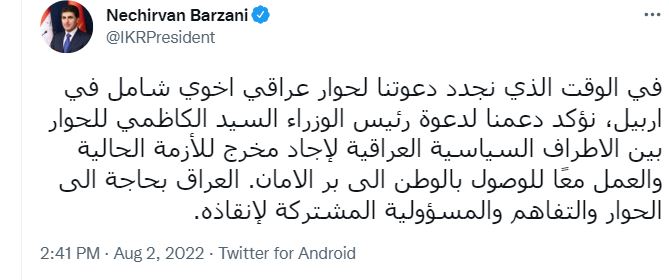ئەمڕۆ سێشەممە (دوو/ئاب/2022) سەرۆک نێچیرڤان بارزانى، سەرۆکى هەرێمى کوردستان لە تویتەر سەبارەت بە دۆخى عێراق پەیامێکى بڵاوکردەوە و تێیدا ڕاگەیاند، " له كاتێكدا بانگهێشتهكهمان بۆ گفتوگۆیهكى عێراقى و برایانهى گشتگیر له ههولێر نوێدهكهینهوه، دووپات له پاڵپشتى خۆمان بۆ بانگهێشتى مستهفا كازمى سهرۆك وهزیران دهكهینهوه، بۆ گفتوگۆكردنى لایهنه سیاسیهكانى عێراق."