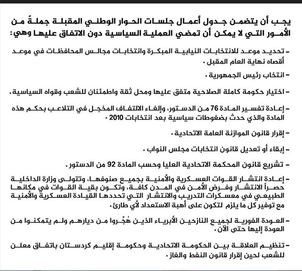 دواتر حهلبووسى خاڵهكان دیارى دهكات كه ئهمانهن: دیاركردنى وادهى ههڵبژاردنى پێشوهختهى پهرلهمان و ههڵبژاردنى ئهنجومهنى پارێزگاكان كه له ماوهى ساڵێك زیاتر نهبێت، ههڵبژاردنى سهرۆك كۆمار، پێكهێنانى حكومهتێكى تهواو خاوهن دهسهڵات. دووباره لێكدانهوهى مادهى 76 دهستوور. پهسهندكردنى بودجهى گشتى، هێشتنهوه یان ههمواركردنهوهى یاساى ههڵبژادن، دانانى یاساى دادگاى فیدڕاڵى، دووباره رێكخستن و جێگیركردنهوهى هێزهكان و گهڕانهوهى تهواوى ئاوارهكان، له دوایین خاڵیش باس له رێكخستنهوهى پهیوهندى نێوان ههرێمى كوردستان و حكومهتى فیدڕاڵى دهكات.