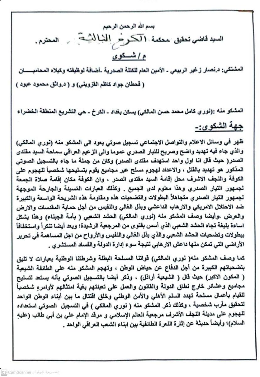 ئهمڕۆ چوارشهممه حهوتى ئهیلوول/2022 نهسار روبهیعى ئهمیندارى گشتى رهوتى سهدر، له رێگهى دوو پارێزهرهوه سكاڵاى لهسهر نوورى مالیكى تۆماركردووه و داواى كردووه، بهگوێرهى مادهكانى یاساى تیرۆر دادگایى بكرێت.